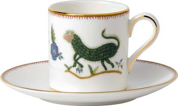 Mythical creates artfully imagined by Kit Kemp make their way around this fine bone china espresso cup and saucer set rimmed with feathery goldtone trim.