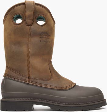 These Georgia Boot pull-on Muddog Comfort Core work boots are durable and comfortable. These wellington boots are made with only the toughest of materials, such as SPR leather. Compared to traditional leather, SPR leather is roughly 3 times as strong and resists abrasions 2. 5 times as well. It stands up to many chemicals and acids due to a rare blend of proprietary materials, making it a great choice for a ranch work, and many other harsh environments. This men s work boot has a rubber Phoenix outsole that s designed to resist chemicals, oils,and slips. It s non-marking and provides cushioning as you go about your work. The comfortable boot has a Comfort Core insole which features a heel plug for shock absorption and airflow channels promote breathing. A fiberglass shank provides arch support and steady footing. For -resistance and comfort, pull on these Georgia Boot Muddog work boots.