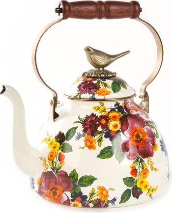 As much decor as it is utility, this heavy-gauge-steel tea kettle is hand-glazed and features an acacia-wood handle and a brass-finish bird knob.