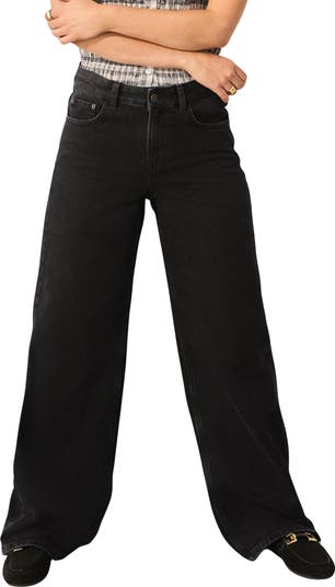 Throw it back to the ultrabaggy fits of the 90s with these inky-black jeans cut in a high-waisted silhouette that s fitted through the waist and hips before relaxing.