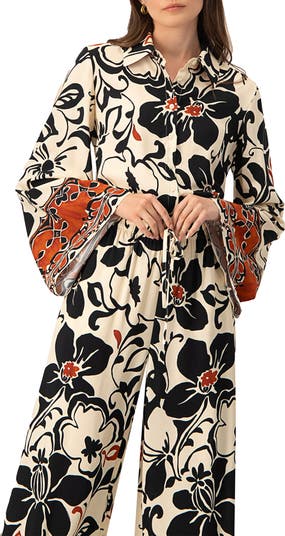 Long shirt with flared long sleeves, front buttons and collar.