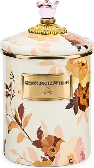 Hand-applied flowers bring signature color and artistry to a beautiful enameled steel canister featuring a clear glass knob at the lid. A bronzed rim and logo plaque give the canister a charming finishing touch.