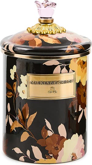 Hand-applied flowers bring signature color and artistry to a beautiful enameled steel canister featuring a clear glass knob at the lid. A bronzed rim and logo plaque give the canister a charming finishing touch.