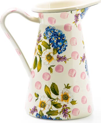 Lemonades, iced teas and other warm-weather beverages are perfectly served in this summery enamel pitcher decorated with hand-painted spots and vintage-inspired floral transfers.