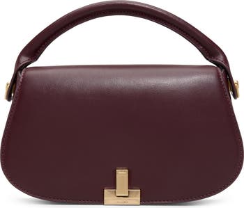 Geometric logo hardware gleams against the smooth faux leather exterior of a structured bag featuring an optional, adjustable crossbody strap for comfortable hands-free wear.