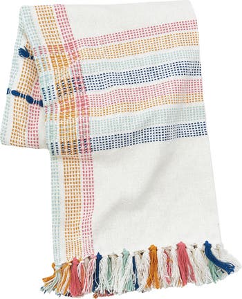 Colorful hibiscus, ochre, surf, and indigo yarn stripes give the Willie Throw its bright and cheerful style. This 100% cotton ladder woven throw is finished with a fringe of multi-tone tassels that fits right in with free-spirited bohemian decor and youthful home styles.