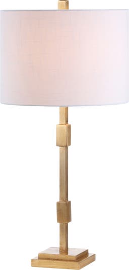 Geometric simplicity done right, this gold leaf stunner is worlds away from average. Its trend-forward column structure and stepped pedestal base evoke strong edges, in contrast to the lovely linen drum shade that softens the look. The gold leaf details extends to the matching finial, while the cord is silk-wrapped for an added luxe touch.
