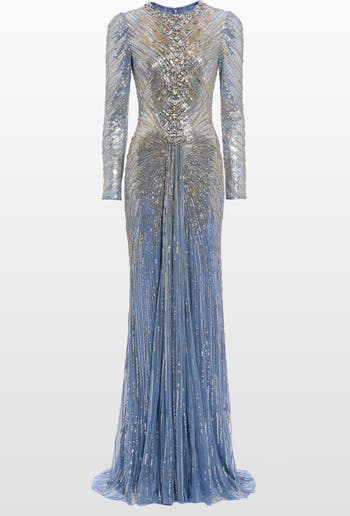 This striking gown captures a sense of celestial drama with its intricately embellished design. The fitted silhouette features a round neckline and long sleeves while shimmering beadwork and sequins radiate outward in striking geometric patterns that enhance and elongate the figure. A softly gathered skirt adds fluidity and movement, making this gown a standout choice for occasions that demand unforgettable elegance.