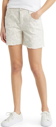 Sport a vibrant style on a sunny day in frayed stretch-cotton floral shorts fashioned with Ab solution shaping panels that comfortably mold and hold.