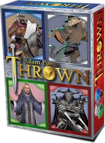 Many are familiar with the idea of a trick-taking game: cards are played, with suits mattering, and you are trying to get the highest value on the table. Sometimes there are trumps which override the suits. In Thrown, the way to play into a trick is by using dice! The colors of the dice represent the suits. The lead player rolls 1-3 dice of a color (the suit) and the other players try to roll in-suit to get the highest value on the table. If you do not have the right suit, then you can roll for trump: rolling a natural 6 on one of your dice in an off-suit will beat the highest value in-suit. Winning a trick gives you gold. The game ends when there are a number of rounds played equal to the number of players. The winner is the player with the most gold. But wait, there are cards in the game too! These cards give special abilities which are paid for, or activated with, dice of particular colors. Some of the effects include: flipping your or your opponent’s dice to their opposite sides, removing dice, re-rolling dice, automatically winning with a particular roll, and more!