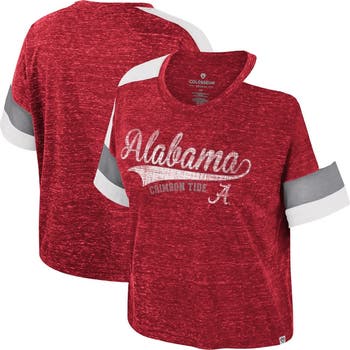Bring bold Alabama Crimson Tide spirit to your game day look with the Colosseum Ruth Color Block Scoop Neck T-Shirt. This stylish tee features a unique color block design and distressed details that create a vintage-inspired aesthetic. The horizontal stylized team wordmark printed across the chest proudly showcases your Alabama Crimson Tide spirit.