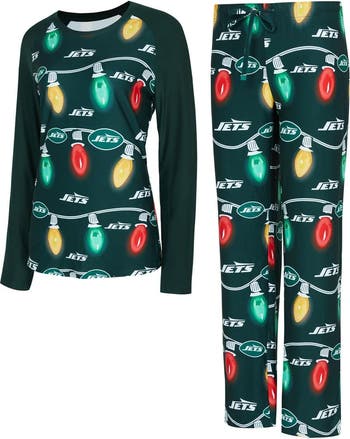 Stay warm and cozy while repping your New York Jets with the Concepts Sport Garland Knit Raglan T-Shirt and Pants Set. This New York Jets sleep set boasts a festive design with all-over repeating graphics of the team logo and string lights, perfect for celebrating the holiday season. The raglan sleeves offer a roomier, more comfortable fit, while the pants feature an elastic waistband with a drawstring for a personalized feel.