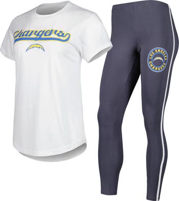 Feel like you re sleeping on a cloud with this cozy Concepts Sport Sonata set. It includes a T-shirt and leggings decked in Los Angeles Chargers graphics with complementing stripes that speak to your fandom. The classic tee construction and stretchy elastic waistband provide extra comfort as you dream of Los Angeles Chargers victories.