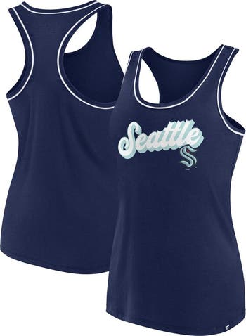 The Women s Fanatics Branded Deep Sea Blue Seattle Kraken Wordmark Logo Racerback Scoop Neck Tank Top is the perfect way to show your support for the Seattle Kraken. Made from soft cotton, this tank top features a scoop neck and screen-printed graphics of the Seattle Kraken logo. Whether you re cheering on the Kraken at the rink or relaxing at home, this tank top is sure to keep you comfortable and stylish.