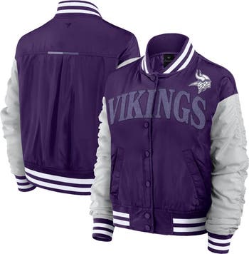 Stay warm and rep the Minnesota Vikings with this Fanatics Elements Wave Full-Snap Jacket. This stylish jacket features a unique ruched sleeve design and a dropped shoulder for a relaxed and comfortable fit. The embroidered chenille team wordmark applique across the chest, paired with the embroidered team logo on the left chest, makes a bold statement of your Vikings pride.