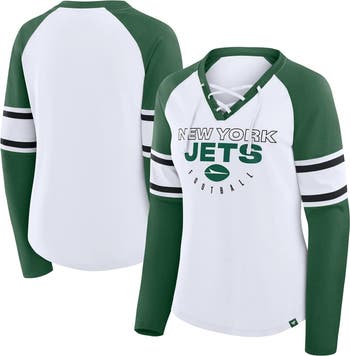 Dress in sporty retro fashion on New York Jets game day with this Redzone Blitz Package Raglan Lace-Up V-Neck Long Sleeve T-Shirt by Fanatics. Its two-tone design features raglan sleeves for ease of movement and a stylish lace-up neckline. Crafted from lightweight jersey fabric, this New York Jets tee offers a comfortable, breathable feel all day.