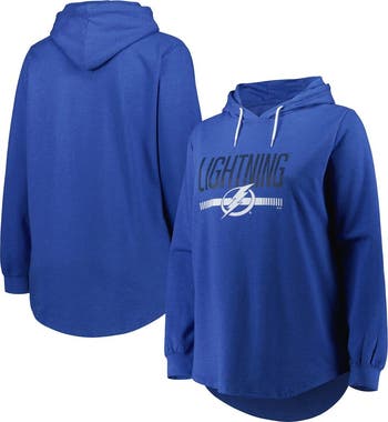 The Women s Heather Blue Tampa Bay Lightning Plus Size Fleece Pullover Hoodie is the perfect way to show your support for the Tampa Bay Lightning. Made from a soft and comfortable cotton and polyester blend, this hoodie features a fleece lining for added warmth on chilly game days. The hood with drawstring provides extra protection from the elements, while the rounded droptail hem gives you a stylish and comfortable fit. The screen print graphics proudly display your Tampa Bay Lightning pride, making this hoodie a must-have for any fan.