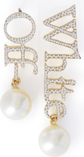 GOLD PLATED - LOGO DESIGN - LOGO EARRINGS W/STRASS&PEARLS BRASS + STRASS