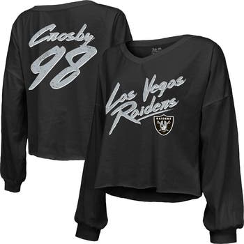 Add trendy Las Vegas Raiders apparel to your wardrobe with this Maxx Crosby Off-Shoulder Script Player Name Number Cropped Long Sleeve V-Neck T-Shirt. Dropped shoulder seams create a relaxed fit, while the cropped, unfinished hem and distressed details provide a vintage look. Made from 100% cotton, this Las Vegas Raiders tee feels comfortable to wear all day.