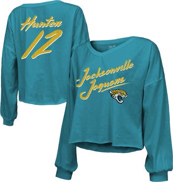 Get ready for the future of Jacksonville Jaguars football with this Travis Hunter 2025 NFL Draft First Round Pick Off-Shoulder Script Name Number V-Neck T-Shirt from Majestic Threads. The stylish, off-shoulder design with a cropped, unfinished hem creates a trendy and flattering look for any Jacksonville Jaguars fan. Crafted from 100% cotton, this tee offers a soft and comfortable feel, while the distressed screen print graphics provide a vintage-inspired touch.