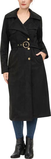 Step out in timeless elegance with the Women’s Natalia Faux Suede Trench Coat. Crafted from soft faux suede, this full-length trench features a striking wide notched collar and smart button front closure for a sophisticated silhouette. The waist is cinched with a matching belt accented by a chic round metal buckle, adding a polished finish while highlighting your figure. Practical side pockets offer everyday functionality, and the long, clean lines make this coat a versatile piece for day or night. Perfect for adding a touch of refined style to your outerwear collection.