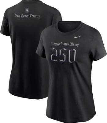 Show your unwavering support for the Army Black Knights as they approach their 250th anniversary with this stylish T-Shirt. This commemorative Nike tee celebrates the rich history and enduring spirit of West Point. Featuring a classic fit, the shirt offers a flattering silhouette while maintaining comfort, and the lightweight fabric ensures breathability all day long. Representing the best of Army athletics and academic excellence, this T-shirt is a must-have for any dedicated fan.