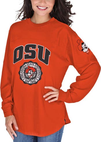 Celebrate your unwavering Oklahoma State Cowboys spirit with the Women s Orange Oklahoma State Cowboys Edith Long Sleeve T-Shirt. This vibrant tee features low puff screen print graphics that proudly display your Cowboys allegiance. Side slits and thumb holes in the cuffs provide added comfort and style, making it the perfect choice for game days or everyday wear. Show your support for the Oklahoma State Cowboys in this officially licensed tee, a must-have for any dedicated fan.
