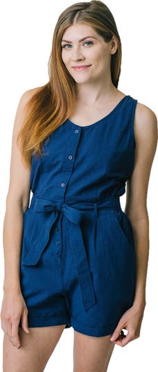 A tie belt and an easy to wear sleeveless silhouette elevates the beach-ready appeal of our breezy organic cotton seersucker romper. Features a button front closure for easy dressing, a removable waist sash, and rolled cuffs at the shorts. And did we mention - it has pockets? Summer, here we come!
