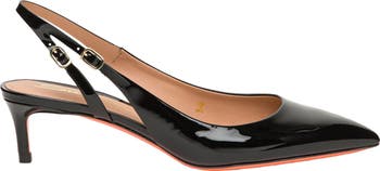 A harmonious fusion of Santoni s heritage codes, this slingback is the definition of exclusive elegance. Crafted from patent leather, its sleek silhouette features a tapered toe and a strap on the back inspired by the iconic lines of our signature double buckle. Styled with a comfortable mid-height heel that works effortlessly with both casual and evening looks alike.