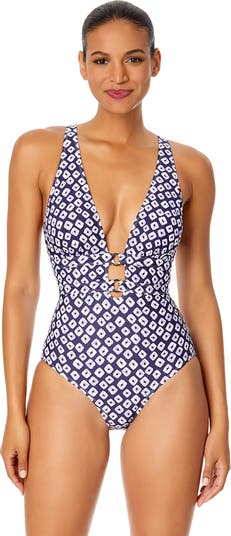 Look stylish at the beach this season in our Shibori Geo Double Ring Plunge Front One Piece Swimsuit. The deep V-neckline features a sleek double ring accent that adds a modern touch, while the intricate shibori geometric print brings a fresh, stylish flair to your swimwear. Designed with flattering silhouette, this one piece swimsuit is perfect for your next swim occasion and beach getaway. Pair it with any Anne Cole cover up for a chic and versatile summer outfit. Model wearing a size 6 .Over The Shoulder and Adjustable Straps