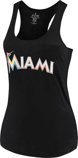 The Women s Soft as a Grape Black Miami Marlins Plus Size Swing for the Fences Racerback Tank Top is the perfect way to show your support for the Miami Marlins. Made from a soft and comfortable burnout fabric, this tank top features a flattering swing fit and a racerback design. The Miami Marlins logo is proudly displayed on the front, so you can show your team spirit wherever you go.