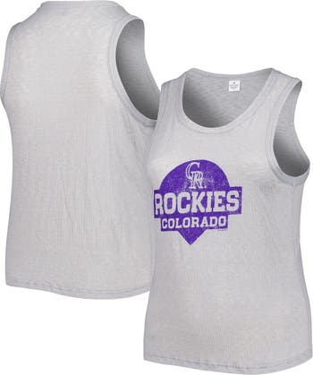 The Women s Soft as a Grape Gray Colorado Rockies Plus Size High Neck Tri-Blend Tank Top is the perfect way to show your support for the Colorado Rockies. Made from a soft and comfortable polyester, rayon, and spandex blend, this tank top features a high neck and distressed details for a vintage look. The scoop neck and sleeveless design make it perfect for warm weather, and the Colorado Rockies logo on the front shows your team spirit. Whether you re cheering on the Rockies at the stadium or just relaxing at home, this tank top is a must-have for any fan.