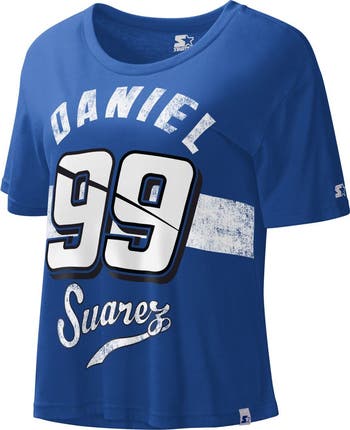 The Women s Starter Royal Daniel Suarez Record Setter T-shirt is a must-have for any devoted Daniel Suarez fan. Crafted from a comfortable cotton and polyester blend, this cropped hem tee proudly displays the official Daniel Suarez logo, showcasing your unwavering support for the NASCAR star. Whether you re cheering him on at the track or simply showing your fandom, this tee is the perfect way to represent Daniel Suarez and the NASCAR community.