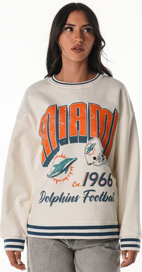 Kick back in style and comfort with this Miami Dolphins Oversized Vintage French Terry Sweatshirt from The Wild Collective. The midweight fleece offers all-season wear, while the oversized fit and dropped shoulders create a relaxed silhouette. Distressed printed Miami Dolphins graphics and striped ribbed trim add a vintage touch, making this sweatshirt the perfect way to rep your team on game day.