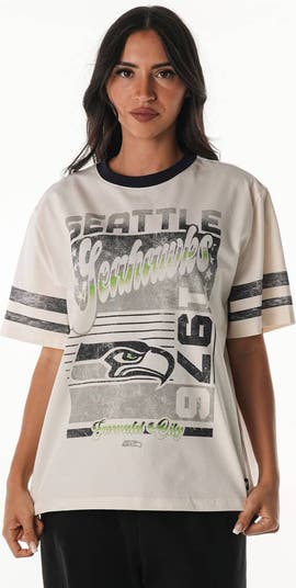 Show off your timeless Seattle Seahawks pride with this Vintage Boyfriend T-Shirt from The Wild Collective. Designed with dropped shoulders for a loose, relaxed, oversized fit, this tee offers effortless style and comfort. The distressed screen print team graphics add a vintage touch, making it a standout piece in any Seattle Seahawks fan s wardrobe.