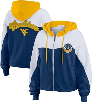 Embrace cozy style while cheering on the West Virginia Mountaineers with this WEAR by Erin Andrews Color-Block Full-Zip Hoodie. This midweight sweater features the West Virginia Mountaineers name and logo embroidered across the back in coordinating team colors for a spirited look that s perfect for game day. Plus, the soft, highly absorbent sponge fleece delivers good thermal insulation.
