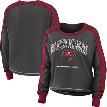 The Women s WEAR by Erin Andrews Pewter/Red Tampa Bay Buccaneers Color Block Modest Crop Long Sleeve T-Shirt is a stylish way to show unwavering support for the Tampa Bay Buccaneers. Its eye-catching color block design and screen print graphics proudly display team allegiance. Sewn-in contrast stripe and heat-sealed graphics add sophistication, while flat lock stitching and rounded droptail back ensure a comfortable fit. Whether cheering from the stands or showing Buccaneers pride, this T-shirt is the perfect way to represent your favorite NFL team.