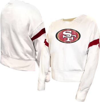 Stay cozy and show off your San Francisco 49ers pride with this Fleece Pullover Sweatshirt from Fanatics. This incredibly soft fleece sweatshirt boasts a relaxed, loose fit and a slightly cropped hem that sits right at the hip for a flattering look. The contrast-color striped insets at the shoulders and distressed screen print team logo at the front add a touch of sporty style.