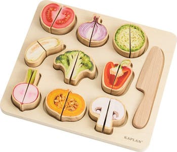 18 months up. Encourage children to learn about shapes, identify various vegetables, and engage in conversations about healthy foods using this durable wooden puzzle. Includes 9 vegetables, a wooden cutting board with beautifully printed images, and a wooden knife. Puzzle board measures 10.5"L x 9.5"W x .4"H.