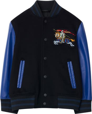 A bomber jacket in soft wool cashmere with contrasting calf leather sleeves in signature Knight Blue. Our logo is appliquéd at the back with a colourful take on the Equestrian Knight Design embroidered at the front. The style is fully lined and framed with striped rib-knit trims.||Press-stud closure|Side jet pockets