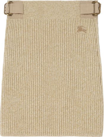 A rib-knit mini skirt crafted in Italy from heavyweight wool cashmere. The design is detailed with cotton nylon gabardine straps to adjust the fit at the waist. Part of our Gabardine Capsule, the design pays homage to the house’s iconic signature – a revolutionary fabric invented by Thomas Burberry, worn by explorers and everyday adventurers alike.||B buckle waist adjusters|Embroidered Equestrian Knight Design at side