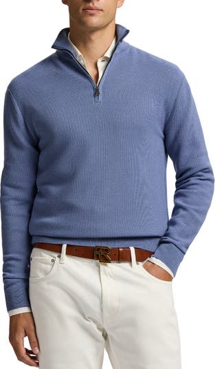 A double-piqué knit made of worsted wool brings exceptional comfort to a pullover fashioned with a posh stand collar and a sporty half-zip closure.