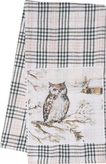 Elevate kitchen decor with the Woodland Owl Kitchen Towel. This practical yet stylish woven applique towel showcases a charming watercolor illustration by Susan Winget. Featuring a serene owl perched in a peaceful winter woodland setting, this illustration is complemented by a green and natural plaid background. The calming sage hues not only add a touch of elegance to the kitchen but also makes drying dishes a delight.