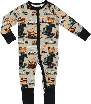 Convertible one piece footed romper in buttery soft viscose. Featuring an epic print for construction truck obsessed kids that works from the sheets to the streets.
