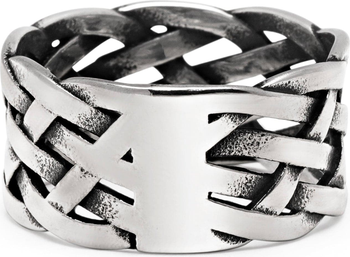 A woven chain ring crafted in stainless steel, featuring an intricately designed chain motif and antique finish for a vintage-inspired look. This piece blends classic sophistication with contemporary style and is handmade for unique character.