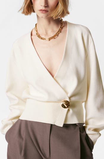 A soft knit brings stylish warmth to any outfit in a beautifully draped cardigan with ribbed trim and a gleaming golden button at the front.