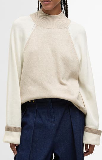 Designed for ease that reads refined, this mock-neck sweater channels sporty colorblocking across a wool-enriched knit that offers breathable warmth and a smooth handfeel while keeping the profile relaxed. Side slits stabilize the hem and unlock movement for day-to-night wear.