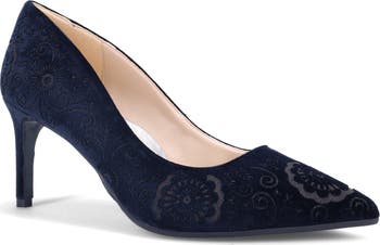 Channel your inner fashion icon with this laser-cut velvet pump, part of a limited edition collection by Ron White designed for lead character Miranda Priestly in The Devil Wears Prada Musical, played by Vanessa Williams. All Day Heels® technology featuring a PORON®-cushioned footbed, slip-resistant sole and Superflex construction offers premium comfort.