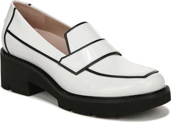 A softly lugged platform and a sleek patent-leather upper put a contemporary spin on a footwear classic with this luxe loafer topped with a squared apron toe.