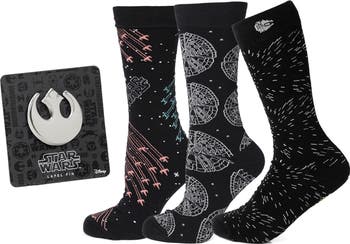 Rep your love of that galaxy far, far away from your lapel down to your toes with this set that includes three pairs of assorted Star Wars socks with a gleaming label pin of the classic Rebel insignia.